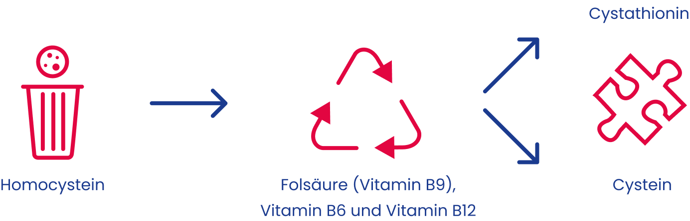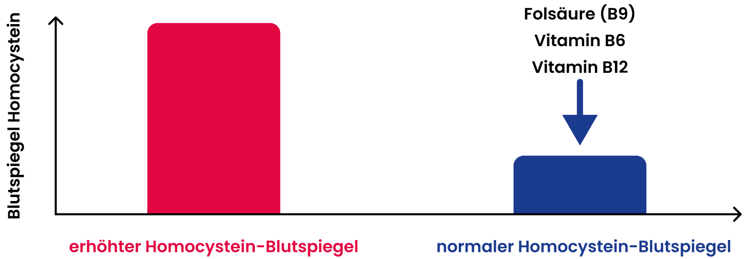 Die drei Vitamine Folsäure (B9), B6 und B12 wandeln Homocystein um und regulieren damit den Homocystein-Blutspiegel. Eine ausreichende Versorgung mit den drei Vitaminen ist daher für einen ausgeglichenen Homocystein-Blutspiegel wichtig.
